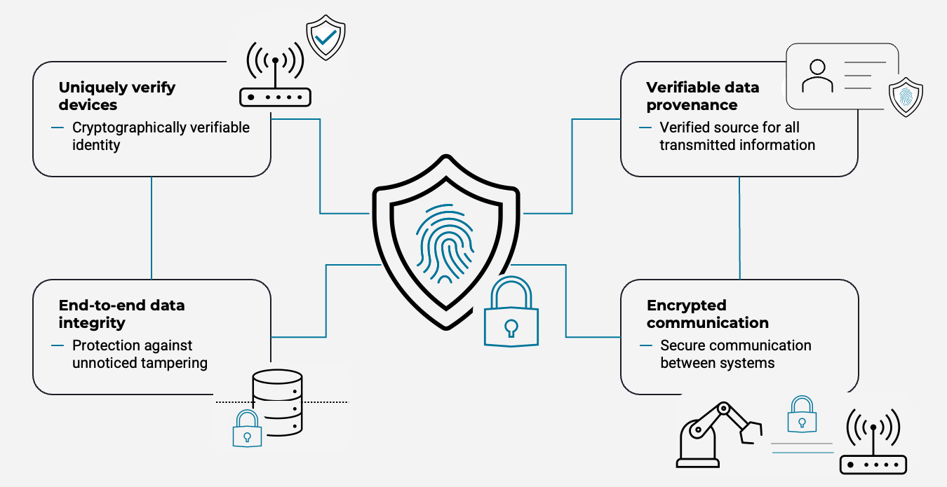 Data is only trustworthy if its source is verified. Digital identities ensure that production and status data originate from authenticated systems.
